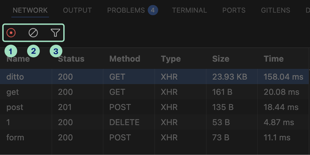 - Toggle network activity recording - starts or stops the capture of network requests made by your application.