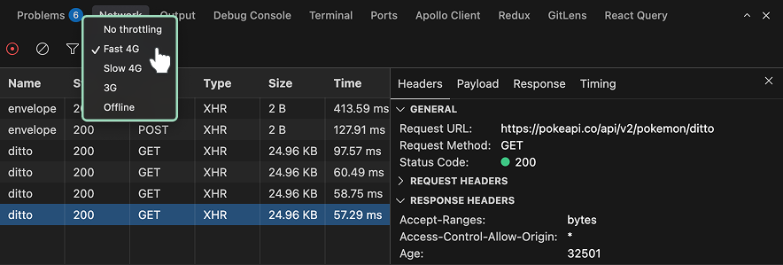 When connected to an iOS Simulator, the Network Inspector allows you to throttle or turn off the network connection on the device. You can choose one of the presets in the drop-down and see how your application behaves in a network constrained environment or when disconnected from the Internet entirely.